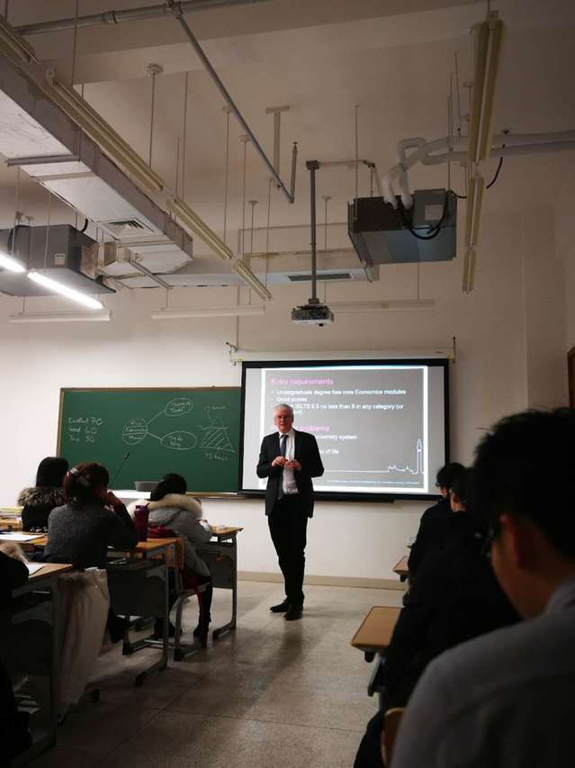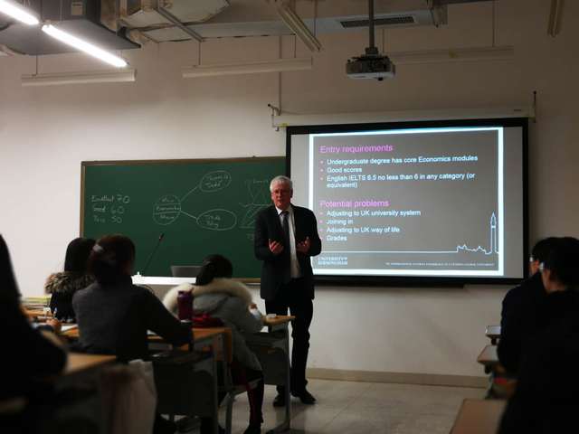 (通讯员:张弦)12月12日,2018年英国伯明翰大学硕士联合培养项目宣讲会在金融学院举行。我校特邀英国伯明翰大学商学院经济系Horsewood教授与同学们见面,就学生们最为关心的伯明翰大学介绍、城市概况、项目专业、课程学分设置、录取要求、申请流程等进行详细的说明,并与参会学生进行了互动答疑。宣讲会气氛活跃,同学们参与积极、场面热烈。