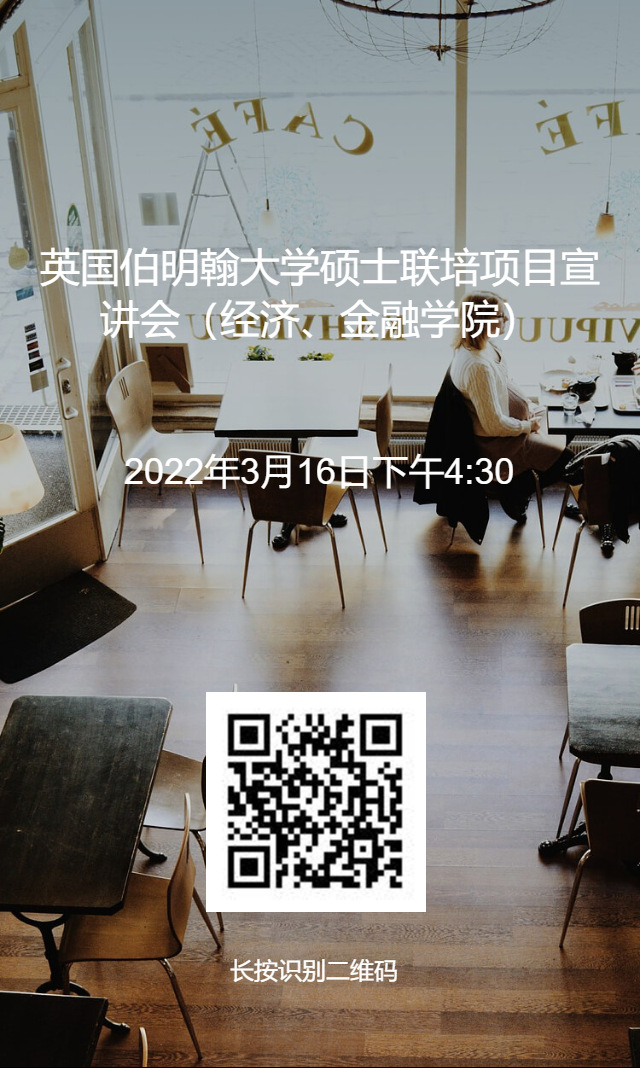 2022年3月16日北京时间下午4:30,我校与英国伯明翰大学硕士联培项目宣讲会将在线上举行。届时,伯明翰大学商学院教授David Dickinson将参会,为同学们做项目介绍并进行答疑。有意向参加硕士联合培养的同学,可扫描下方海报二维码提前报名。