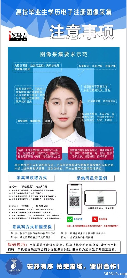 6.图像应真实表达毕(结)业生本人相貌,不得对人像特征(如伤疤、痣、发型)进行技术处理(PS)。请参加采集的学生,务必按照上述要求前来拍摄,提前做好拍摄准备。未按上述要求做好准备的学生,均不予采集。